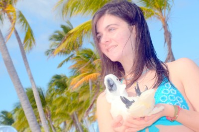 | Fabiola alle prese con il cacatua, pappagallo di origine malese |
