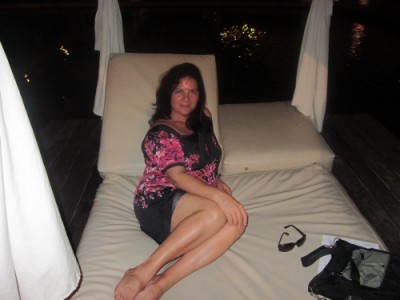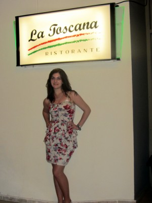 | Il villaggio possiede 13 ristoranti . Qui Fabiola è davanti a quello italiano |