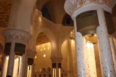 | La Moschea di Abu Dhabi è una delle più grandi al mondo e può contenere 40000 fedeli. Ci sono 4 minareti, 82 cupole, molte delle quali terminano con puntali di oro massiccio, e oltre 1400 colonne. |
