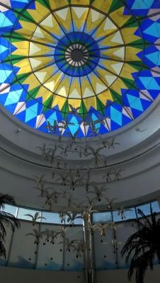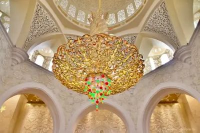 | Il più grande lampadario del mondo rifinito in oro e pietre preziose, posto sotto alla cupola principale, alto 15 metri, largo 10 e con un peso di 9 tonnellate. |