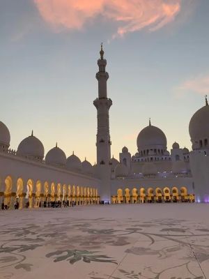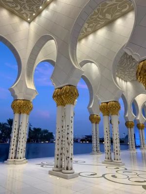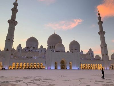 | Moschea Sheikh Zayed, anche conosciuta come moschea bianca per via dei bianchissimi marmi che rivestono le pareti. Appena si arriva alla moschea si può cogliere il fascino particolare che riserva questa imponente struttura e godersi un'ambientazione da Mille e una Notte. Nel 1996 lo sceicco Zayed iniziò a costrire quest'opera, moderna ma allo stesso tempo con forti richiami al passato, con l'intento di unire culture e religioni diverse, qualcosa che rappresentasse "l'unione del mondo", utilizzando materiali e artigiani provenienti da diverse parti del mondo: il marmo bianco dall'Italia e dalla Macedonia, il tappeto più grande del mondo dall'Iran, i cristalli Swarovski dalla Germania, le colonne in madreperla dall'India, i motivi floreali che adornano i muri e il pavimento del cortile dalla Gran Bretagna. Insomma, un mondo di culture, di eccellenze racchiuse in questo luogo. |