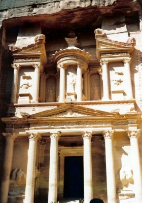 | Petra - il Khazneh ( il Tesoro), un monumento funebre alto 43 metri che, a seconda dell'inclinazione dei raggi del sole, assume diverse colorazioni, dal rosso scuro al rosso chiaro. Questa costruzione è interamente scolpita nella roccia. |