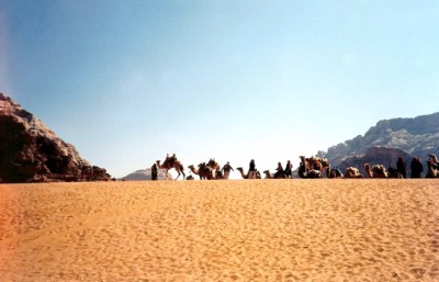 | Nel deserto di Wadi Rum i beduini sono i padroni di casa e si muovono in questo spazio infinito con la naturalezza di chi si sente a casa. Scriveva Jorge Borges : " Lungo il loro percorso le carovane beduine lasciano tracce ed orme nel deserto senza fine. Questo libro di sabbia sconvolto dal vento racconta itinerari divenuti ormai irriconoscibili, una ragnatela stesa al suolo, che sembra non dotata di senso ed invece è ricca di direzioni". |