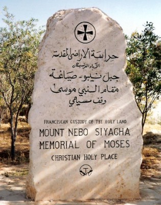 | " Sali su questo monte Nebo, che è nel paese di Moab, di fronte a Gerico, e mira il paese di Canaan, che io dò in possesso agli israeliti. Tu morirai sul monte sul quale stai per salire e sarai riunito ai tuoi antenati" ( Dt 32, 49-50) . Mosè, proprio da questo luogo, contempla, per la prima volta, la sua Terra Promessa. Riesce a vederla senza però mettervi mai piede. Morirà all'età di 120 anni e sarà sepolto su questo monte. |