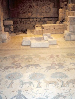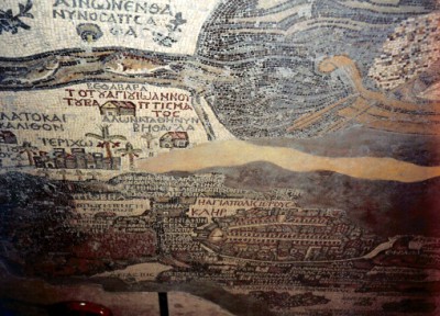 | A Madaba nella Chiesa ortodossa di San Giorgio l'attenzione è attratta da qualcosa a me molto familiare, perchè vista su tanti libri di storia : la prima cartina conosciuta a mosaico della regione orientale del Mar Mediterraneo(560 d.C.) |