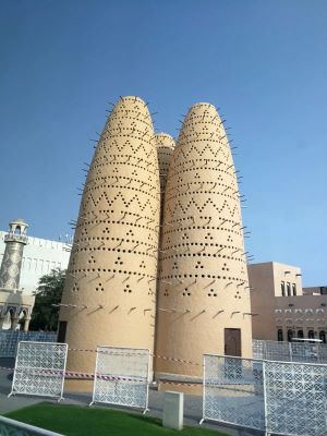 | Davvero particolari sono le decorazioni con paletti di legno che fuoriescono dalle tre torri color sabbia, dette Pigeon Towers (le torri dei piccioni), letteralmente abitate da una multitudine di piccioni bianchi, che fanno capolino dalle centinaia di fessure |